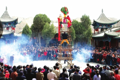 8、道台狮子,一百多年来它作为青城的一种杂技社火流传至今。舞狮活动在我国已有悠久的历史,各地玩法基本相同。但青城有一种玩法则别具一格,必须用长条板凳或者方桌搭起高山架来玩,并由猴子和猩猩配合表演,动作惊险玄妙,故事幽默有趣,且表演者必须有武术功底才能登山表演。2007年道台狮子被列为甘肃省级非物质文化遗产。