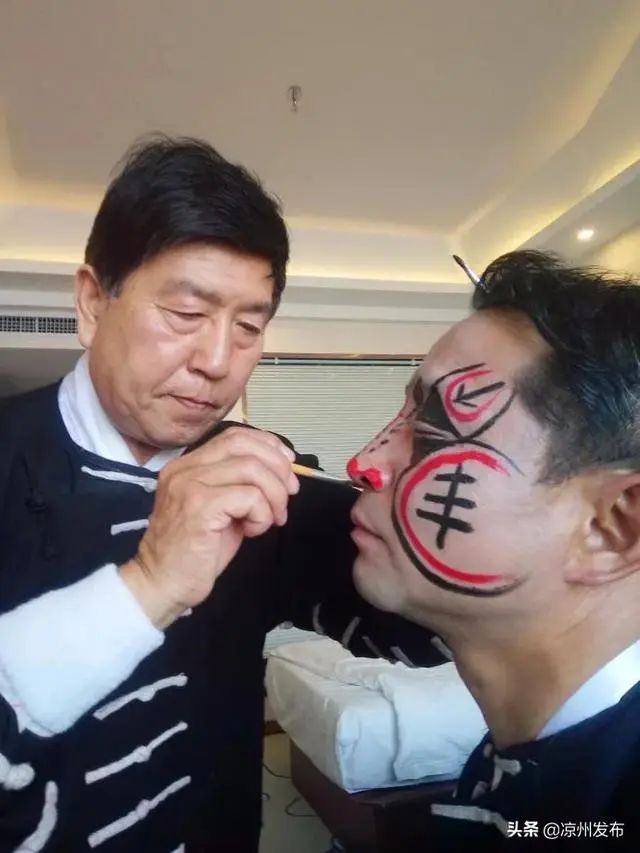 凉州攻鼓子国家级传承人杨门元为鼓手绘制脸谱