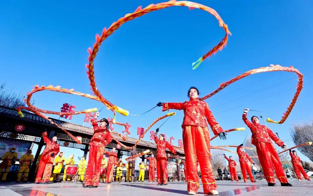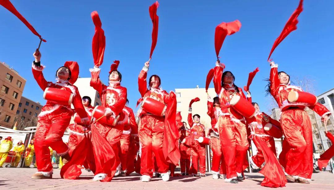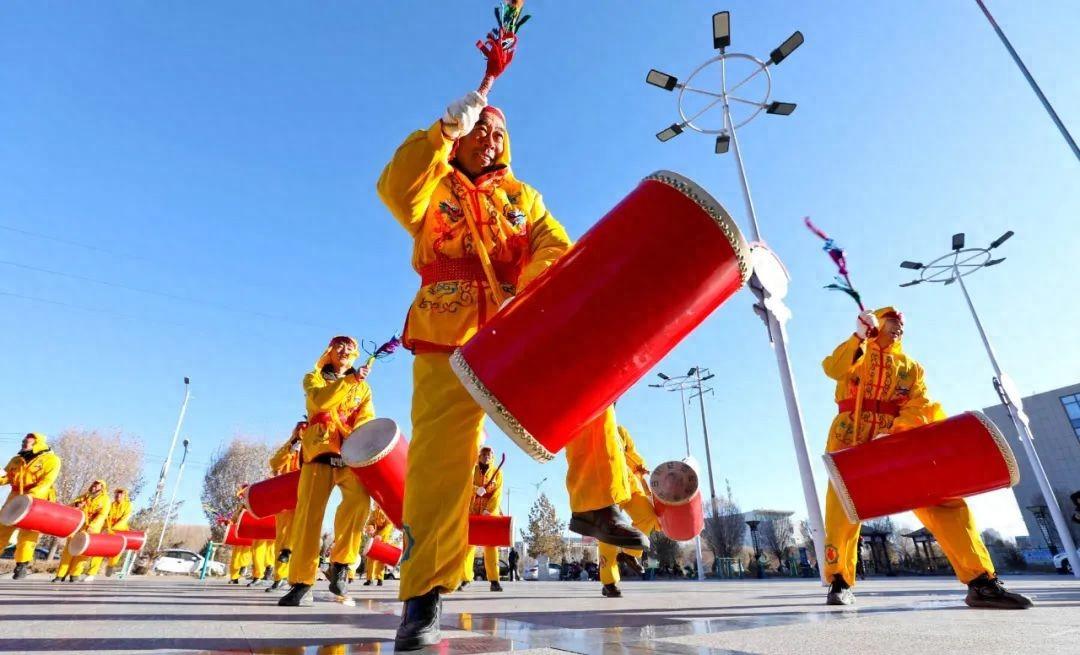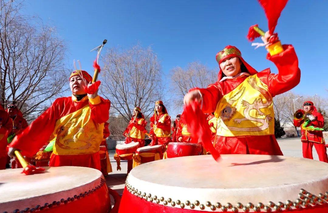 1月28日,临泽县沙河镇惠民社区文化广场上,社火队太平鼓表演组的群众演员们加紧排练《太平盛世鼓欢歌》。