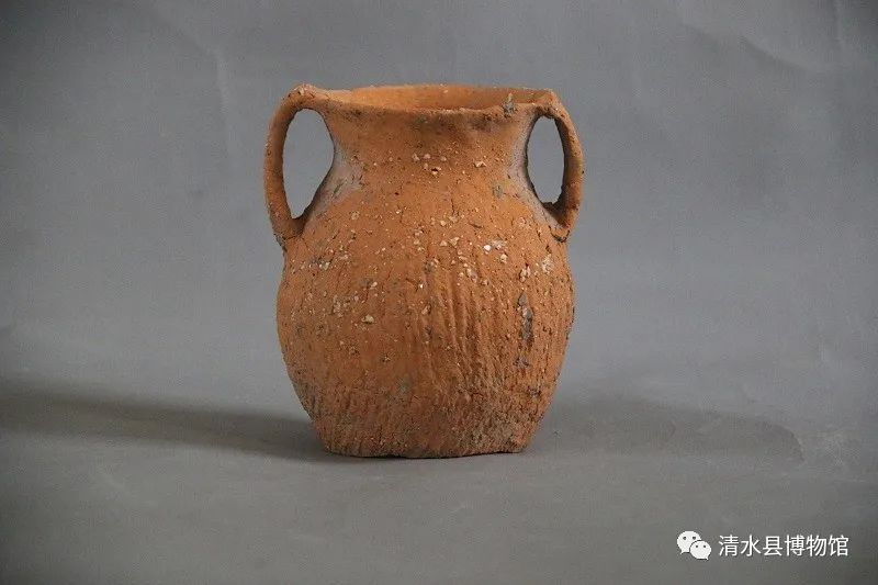 常下文化双耳红陶夹砂罐,高11cm,口径8cm,底径6cm。罐呈夹砂红陶,侈口,双耳,平底,腹部绳纹。