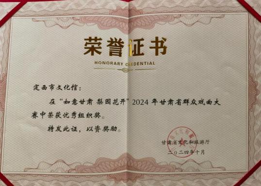 10月20日,在甘肃省文化和旅游厅主办的“绚丽甘肃 梨园花开”2024年甘肃省群众戏曲大赛中,定西市文化馆荣获优秀组织奖。