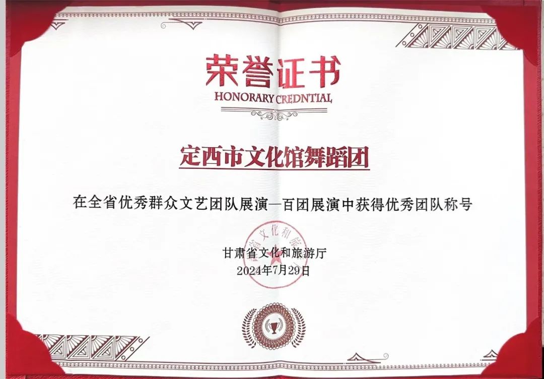 7月29日至30日,在文化和旅游部全国公共文化发展中心、中国文化馆协会、甘肃省文化和旅游厅、中共平凉市委、平凉市人民政府主办的甘肃省优秀群众文艺团队展演——“百团汇演”暨“歌唱祖国”大家唱群众歌咏活动中,原创舞蹈《皮影之舞》代表定西市参加甘肃省优秀群众文艺团队展演“百团汇演”,定西市文化馆舞蹈团被授予全省优秀群众文艺团队展演——百团展演优秀团队称号。定西市文体广电和旅游局荣获优秀组织奖。