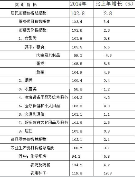 市场物价呈结构性上涨,生产资料价格运行平稳。我县居民消费价格总水平(CPI)为102.8%,同比上涨2.8%,涉及调查的八大类商品和服务呈“七升一降”态势。