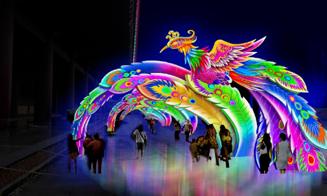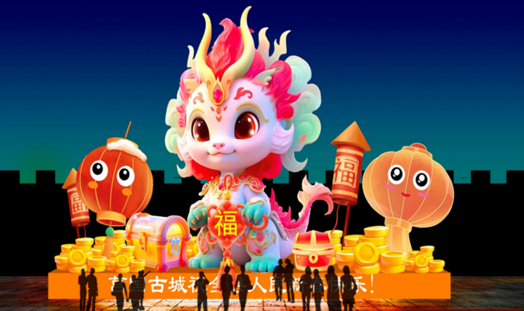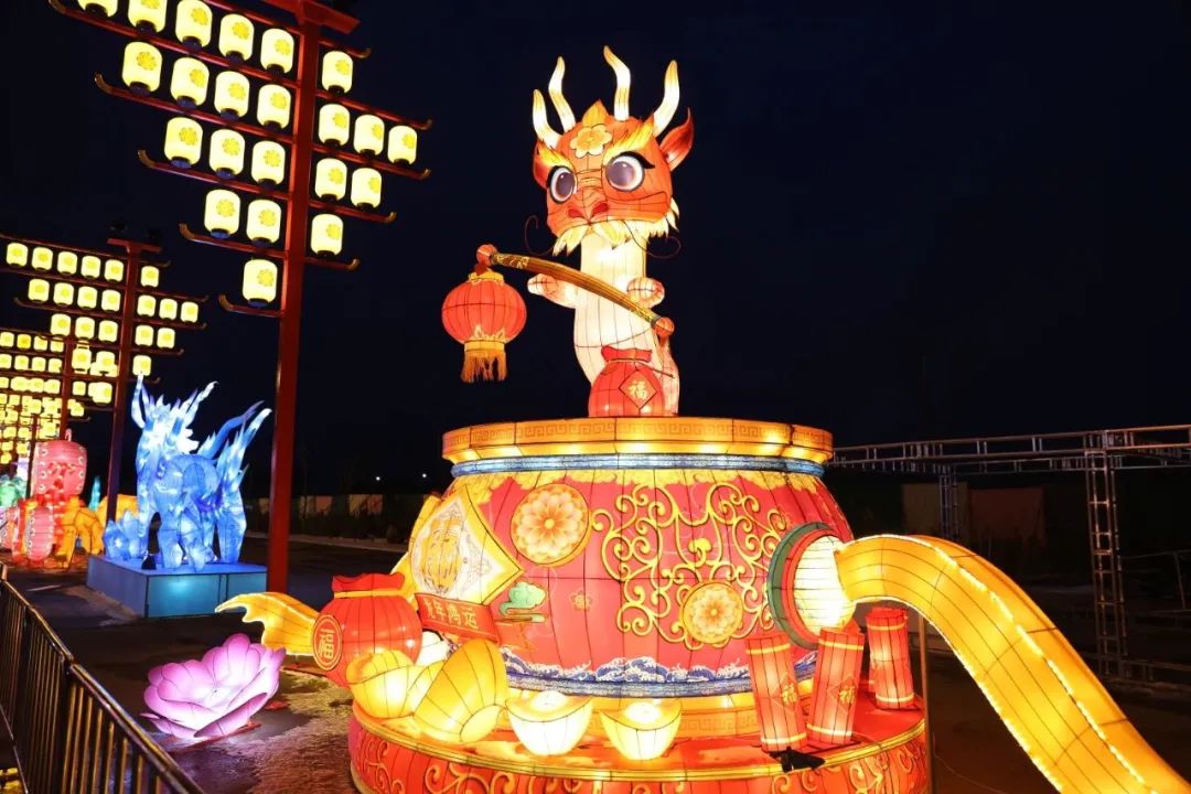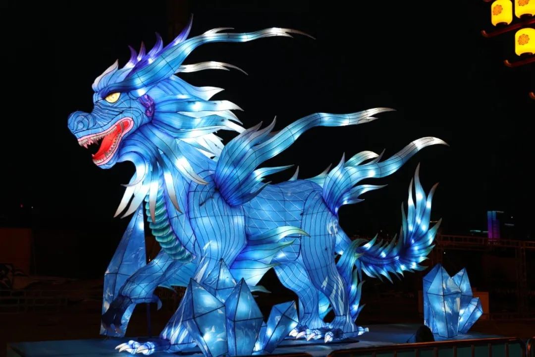 高高的灯柱竖立在天空之下,每一根灯柱都装点着千姿百态的灯彩。巨大的花灯中,神秘的龙图案在灯光的映照下生动而逼真,仿佛要从灯彩中跃然而出。五彩斑斓的灯笼在微风中摇曳生姿,为夜晚的空气增添了一丝神秘感。
