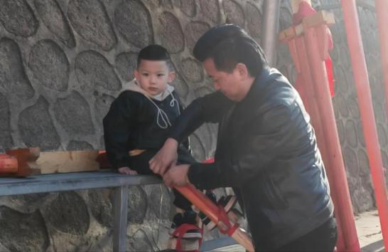 场地一角,前来排练的爷孙俩正在做踩高跷前的准备。“爷爷给你绑紧点,疼了给爷爷说。”爷爷小心翼翼地为七岁的孙儿绑高跷,孙儿满心欢喜地看着高跷表演者。