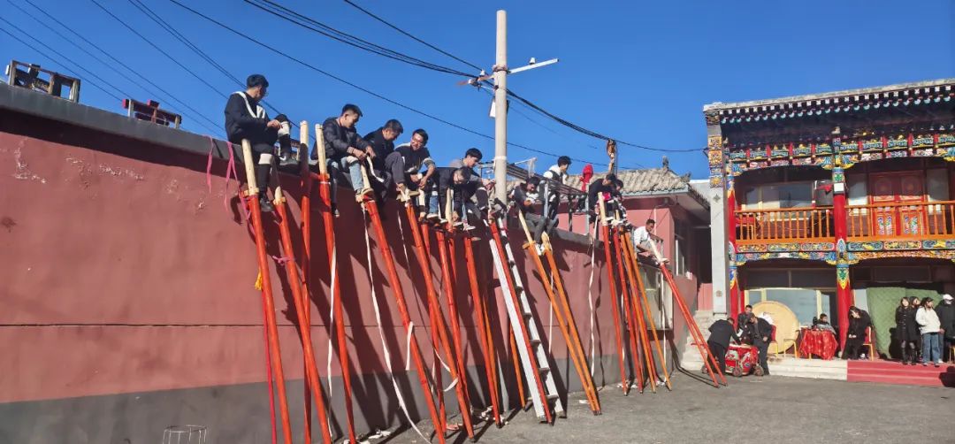 在鲁沙尔社火排练场,三米高的高跷棍整齐地摆放在围墙边,高跷表演者们坐在墙沿上为自己固定绑带。