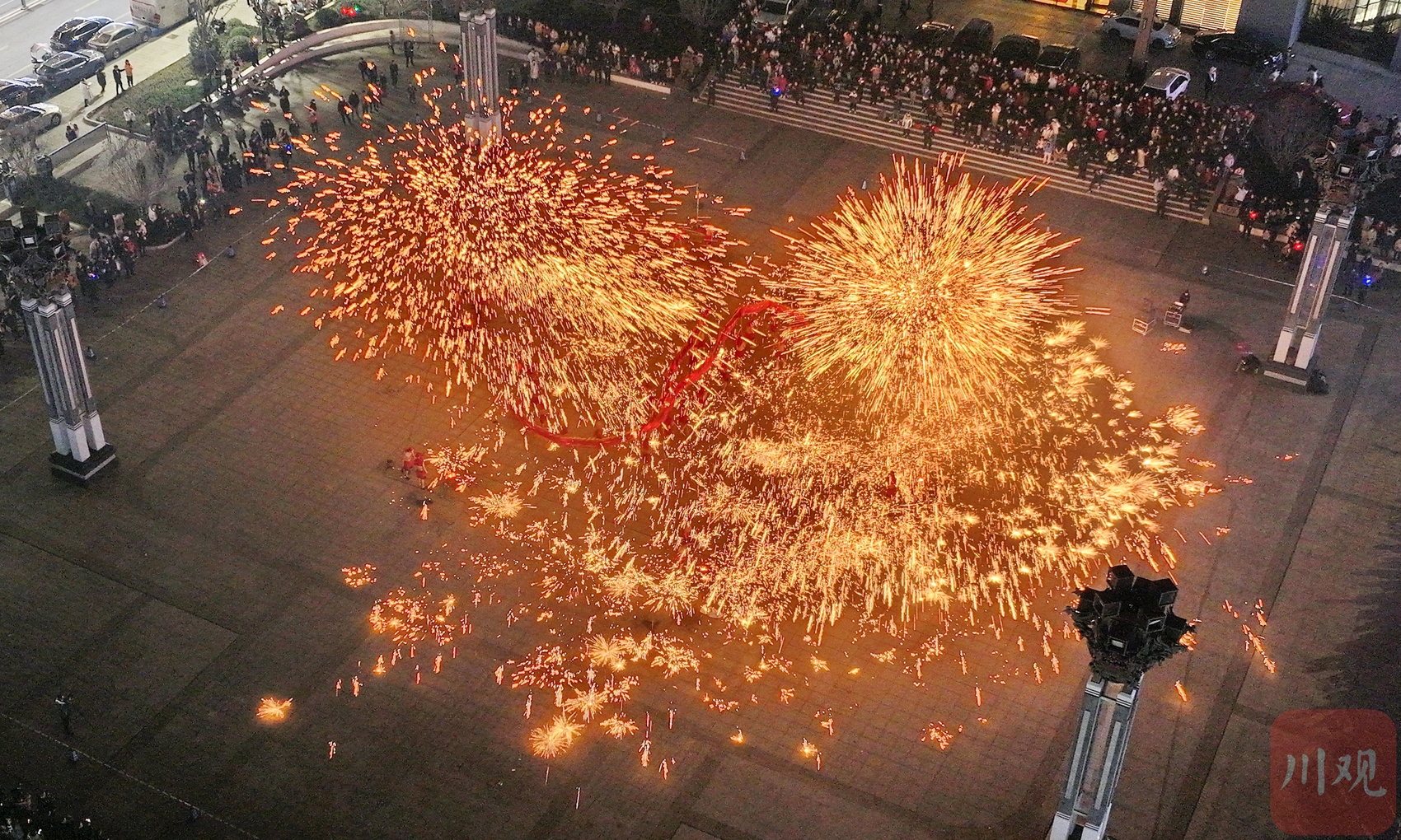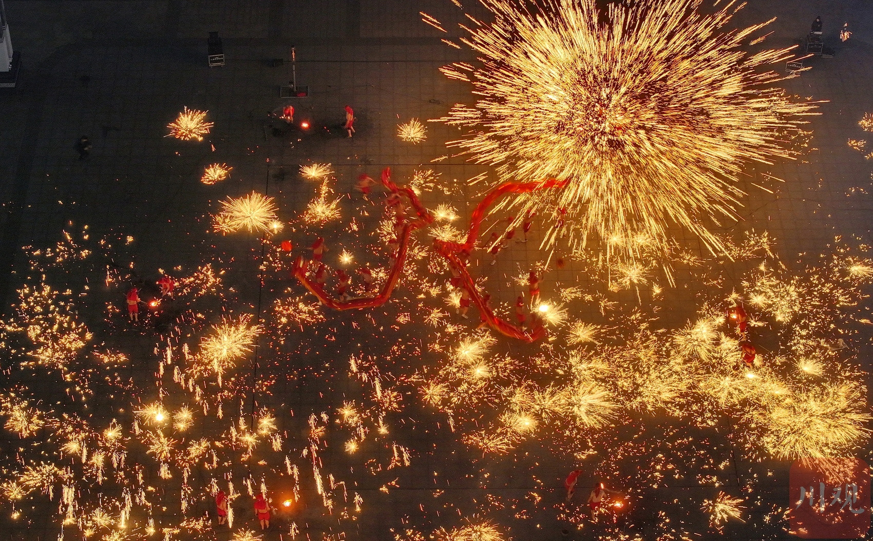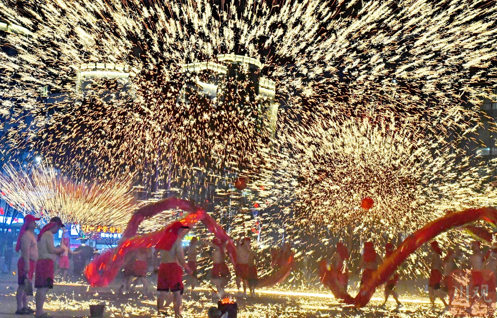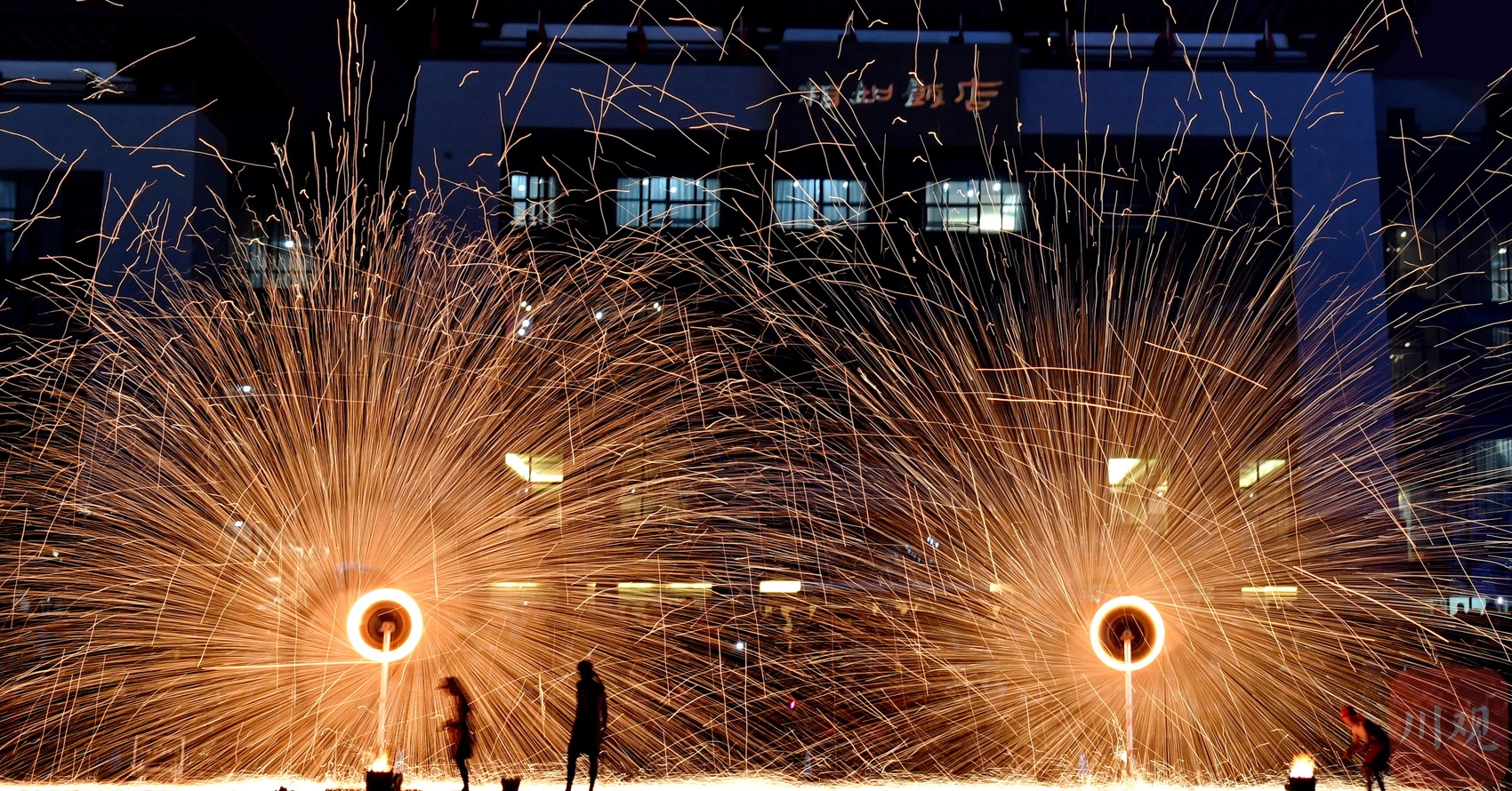 网络中国节丨四川蓬安:民间艺人舞动钢花火龙迎春节