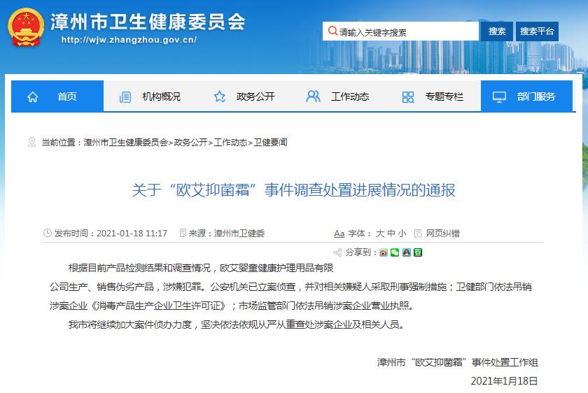 1月18日中午,福建漳州市卫健委网站发布了关于“欧艾抑菌霜”事件调查处置进展情况的最新通报。