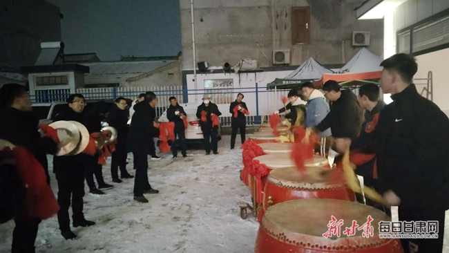 “咚咚咚,嚓嚓嚓……”夜幕四合,城关镇东关村春节社火排演现场,灯火通明,锣鼓喧天,成纪威风鼓正在火热排练。
