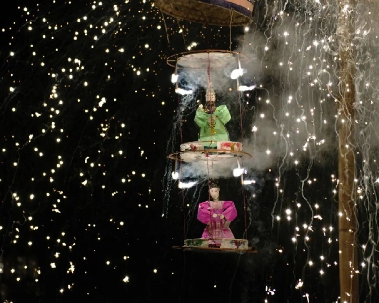 在一根长度为13至15米的毛竹竿上,隔层装置特制烟花轮和身穿光蜡纸服装的木偶,当最底层的烟花轮引线点燃后,会逐层喷放艳丽火花,带动木偶表演。