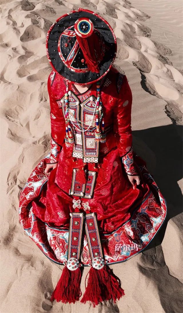 华夏古国,因服饰之美而谓之“华”,因礼仪之盛而谓之“夏”。过新年,穿新衣,寓意着辞旧迎新。在裕固族众多非物质文化遗产项目中,有一项被誉为“穿在身上的非遗”,它就是裕固族服饰。裕固族服饰的特征突出体现在女性服饰之中。裕固族未婚少女前额戴“格尧则依捏”,即一条长红布带的上边缘缀以珊瑚珠,下边缘以五色珊瑚和玉石小珠串成许多穗,垂在前额。除此以外,还要梳五条或七条发辫,辫梢内掺杂彩色丝绒线,系在背后的腰带里。已婚妇女头戴尖顶红缨毡帽和三条长形头面,头面系在三条发辫上,每条又分三段,以金属环连接,上镶银牌、珊瑚、玛瑙、彩珠、贝壳等饰品,构成美丽的图案。头面长短以佩戴者身材高矮而定,要求上齐耳环,下至长袍底边。裕固族男子头戴金边白毡帽,身穿大领偏襟长袍,扎彩色腰带,腰挂香牛皮缝制的烟荷包。帽檐镶以黑边,后部卷起,帽顶正中彩缎上有金线织成的圆形或八角形图案,长袍多用白羊毛线织成的褐子或布和绸缎缝制。