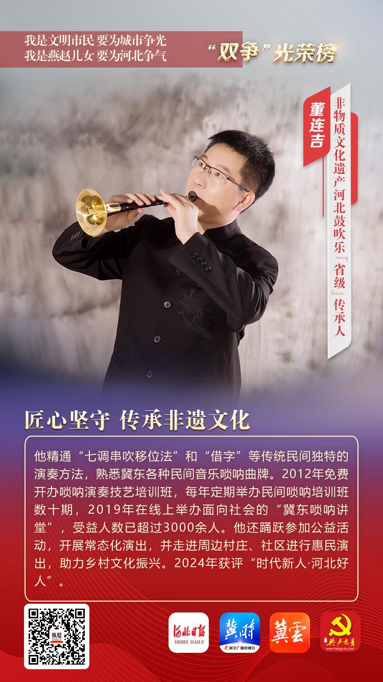 董连吉,男,1978年10月出生,中共党员,国家级非物质文化遗产项目河北鼓吹乐“省级”代表性传承人。