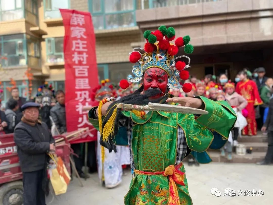 灵台社火是在春节期间以村落为单位进行的一种民间民俗文化活动。一般从正月初十开始,十五、十六结束。演出阵容的表现形式是:仪仗队为先导,它包括“龙凤旌旗”、“锣鼓队”、“春官”、“叫花子”、“害婆娘”;仪仗队之后,则是社火表演队伍,演员装扮形象内容,各不相同,一般装扮成历史、戏剧人物,表演形式多种多样,有“高跷社火”、“背社火”、“马社火”、“车社火”以及“高芯子”等,近年来多有秧歌队、腰鼓队、模特队加入,还有杂耍类如舞狮子、舞龙、跑旱船等。耍社火时,靠的是演员的动作表演,并配以旌旗、仪仗、锣、鼓、钹等,规模浩大,场面热烈壮观,在强烈节奏的锣鼓音乐伴奏下,做行进队列或场地定点表演,表演的剧目有《封神榜》、《出五关》、《猪八戒背媳妇》等历史神话故事。