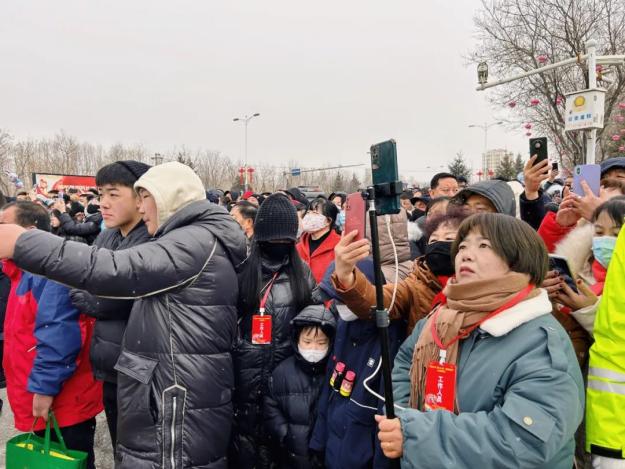 社火表演现场,表演队员们身着盛装,精神抖擞,神采飞扬,踏着欢快的鼓点尽情表演,笑意写在脸上,喜庆荡漾心间。伴随着阵阵锣鼓声,社火演出正式开始,舞龙、划旱船、“蛮婆子”等欢乐喜庆、年味十足的民俗表演纷纷亮相,让现场观众大饱眼福。“攒劲!”“耍得好!”活动现场热烈非凡,喝彩声、欢笑声、锣鼓声不断,观众或拿出手机记录这精彩的瞬间,或抱起孩子共享这欢乐时光,道路两边人头攒动,欢声鼎沸。