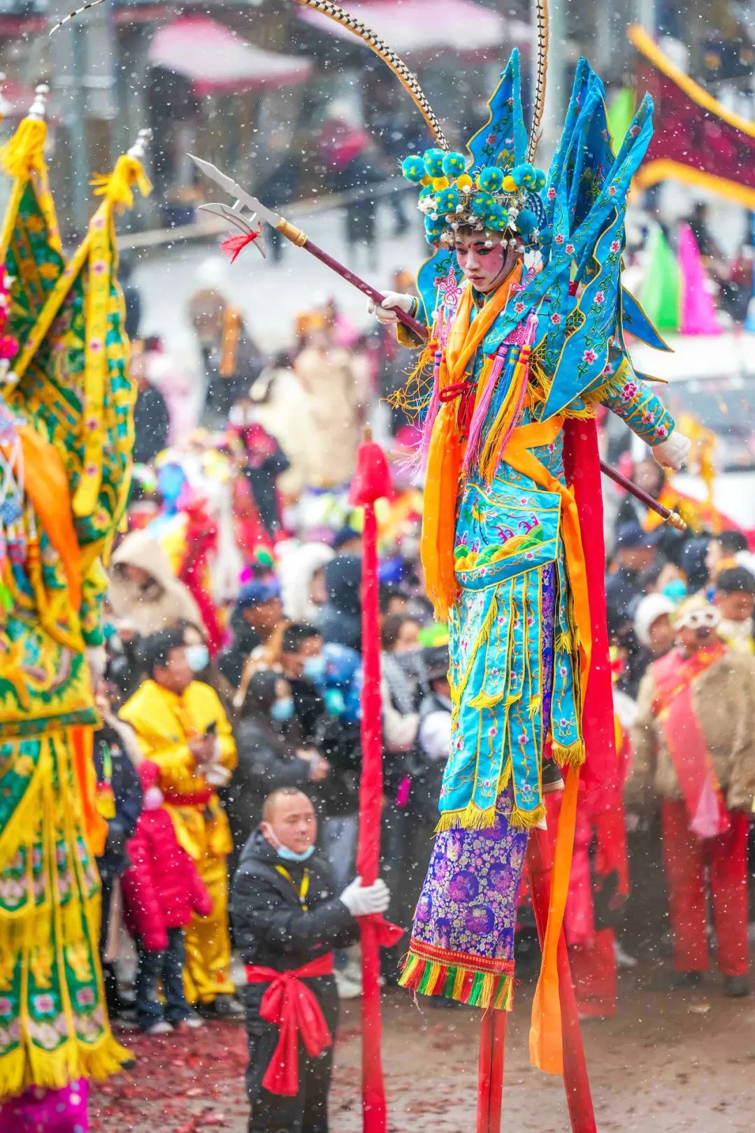 在熙熙攘攘的人群中,有一位身着一袭红色戏装的“女子”格外耀眼。她身背五彩旗,手中挥舞着一杆大刀,身姿挺拔,英姿飒爽,宛如从戏文中走出的巾帼英雄。她所扮演的角色是杨二郎之妻耿金花,然而令人意想不到的是,扮演者耿生朝其实是一名刚刚毕业的大学生。别看他年纪轻轻,早在6岁时,便在家人的耳濡目染下与高跷结下了不解之缘,学会了踩高跷这门独特的技艺。