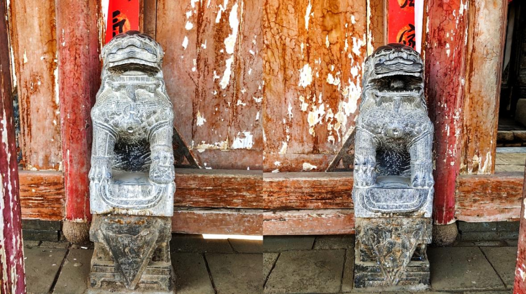 山门口坐一对石狮,守护高家祠堂,保佑高氏子孙平平安安。左边雄狮口中有一滚珠、脚下踩一绣球,象征尊贵和权力,右边雌狮后背有一绣球,雌狮脚下抚一小狮子,后面背一小狮子,象征慈祥、母爱和生育。
