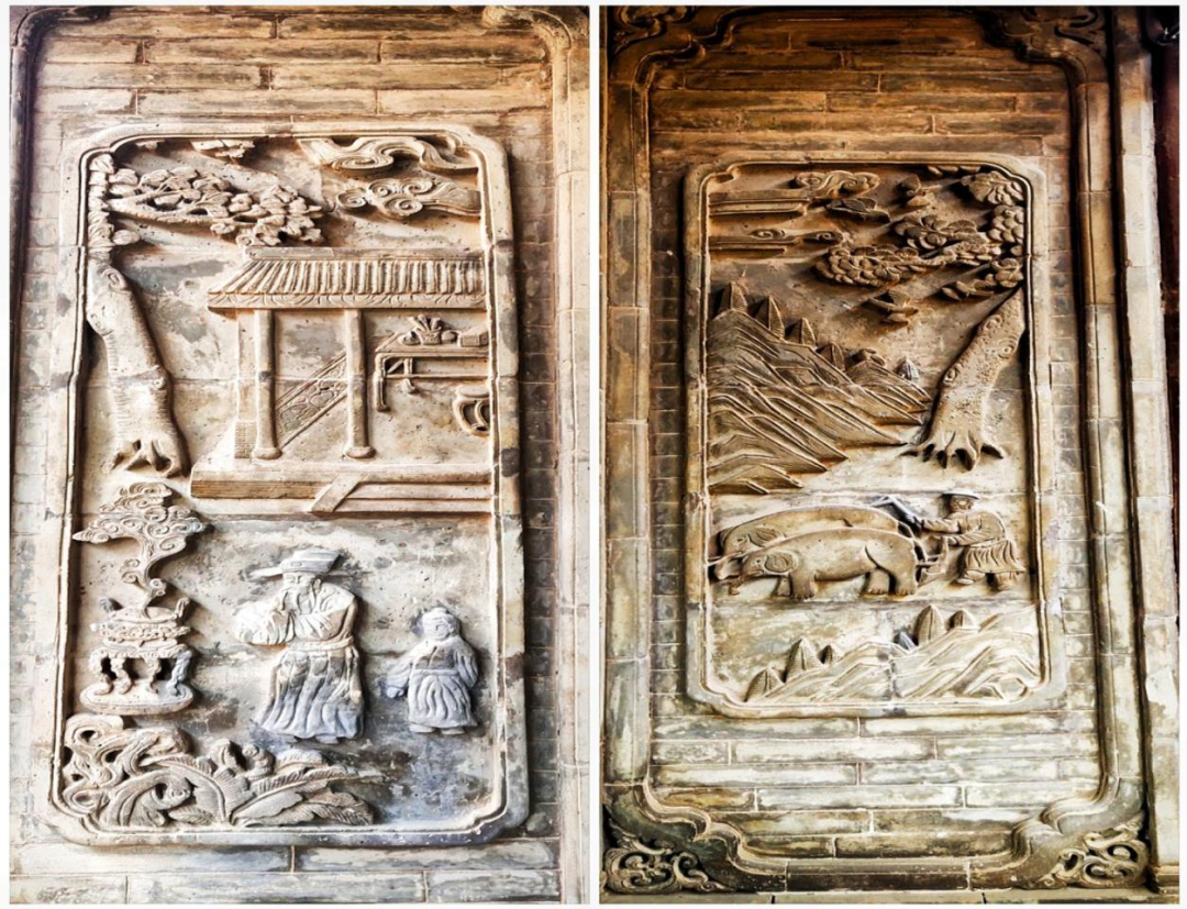 祠堂是讲孝道之地,天下百善孝为先,“孝”是每个人的立身之本,处事之源,也是中华民族的传统美德。东、西墙上各有一幅砖雕。西面砖雕是“十四孝”故事里第一孝——“孝感动天”,即大舜耕田的故事。自古便有舜帝敬孝感动天的传说,砖雕主人公是部落首领舜,舜孝顺又勤苦,从小由继母抚养,继母对他百般刁难,常常欲致舜于死地而后快:让舜抱草缮房,而放火抽梯;让舜打井,而填土盖石;让舜耕田,却不给他耕牛,舜只好用手刨土挖地。即使这样,舜仍然对继母敬重有加,从不违命,他的这份至诚至性的孝心感动了上天,玉帝便派神象为其耕田,神鸟为其锄草。尧帝经过长期考察,将自己的两个女儿给舜为妻,并把帝位让给大舜。这便是“舜帝尽孝感动天,象耕鸟锄尧让贤”。