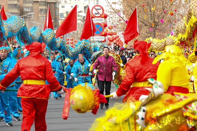 锣鼓喧天、欢声鼎沸。从天丰街到文化广场,从雷台什字到天马湖畔,虽寒意料峭,却仍有春意盎然——铿锵有力的锣鼓、上下翻飞的彩扇、欢腾跳跃的龙狮,经典的扮相、喜庆的服饰、幽默的互动,一队队各具特色的社火合着鼓点尽情舞动。