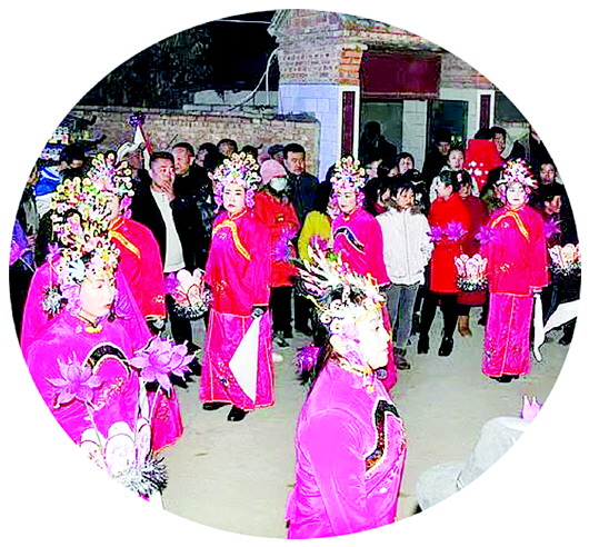 然后就是唱曲子,多为两生两旦,不管男扮女装,或女扮男装,大都是边舞边唱,即所谓的对对戏。也有“对口曲”、小调、对唱、小剧曲目等,其中最具代表性的曲目有《下四川》《李三娘研磨》等。之后就是笑谈,笑谈类似于家常闲话,上场的人物多是两老旦一小旦。在曲调上,有背弓调和月调;在唱词上,各不相同,但都乡土气味浓郁,古朴动听。最好看的则是快书,即溜干场。所谓溜干场,指专门在上下换场的间隙表演。所扮丑角表演时有说有笑,有哭有闹,而内容多为劝善、向善。