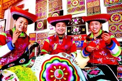 土族盘绣代表性传承人胡兰索卡(中)展示自己和绣娘们的作品。牟泉摄