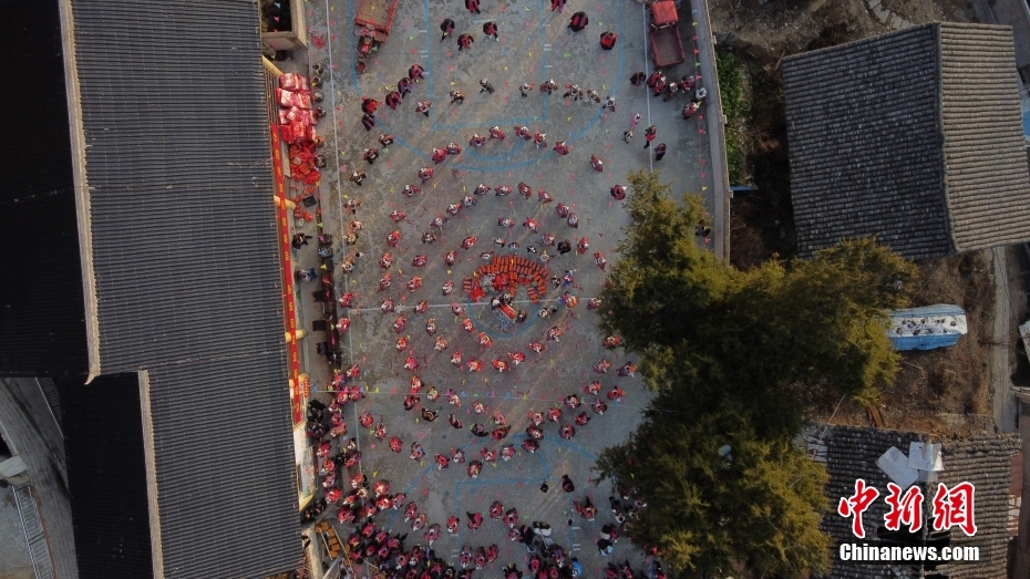 浙江台州,金竹溪村锣鼓喧天,人头攒动,当地安山村舞龙队400多村民舞起一条数百米长的板凳龙,祈愿新的一年五谷丰登、风调雨顺。陈月明摄