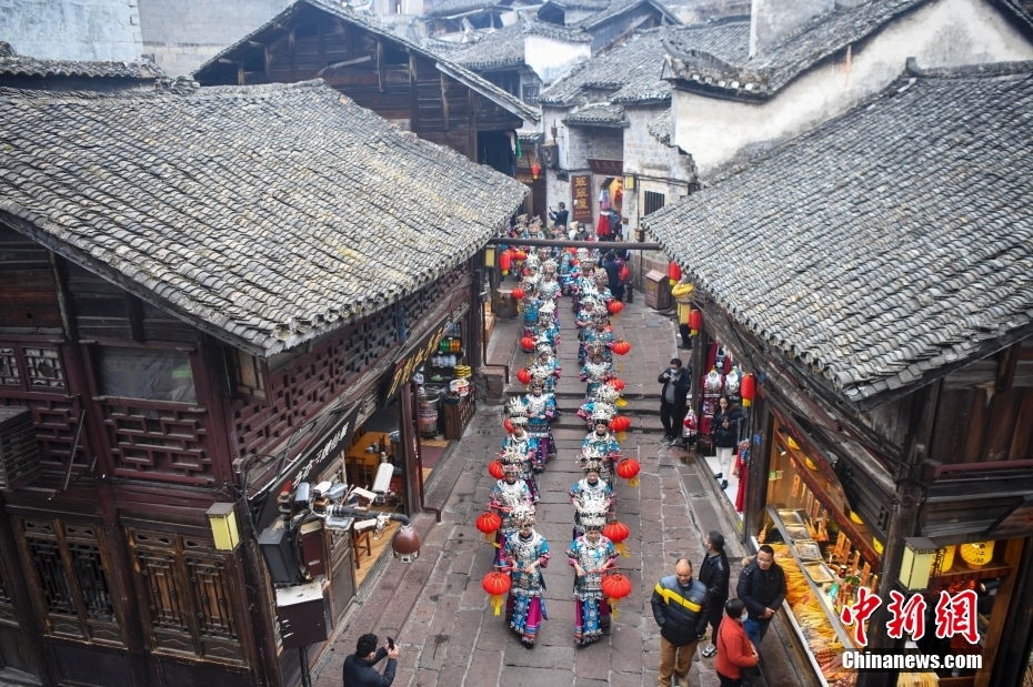 正月初一,湖南湘西凤凰古城的苗家人身着苗族盛装,打着苗鼓、提着灯笼穿梭在古城的大街小巷,庆祝新春佳节的到来。杨华峰摄