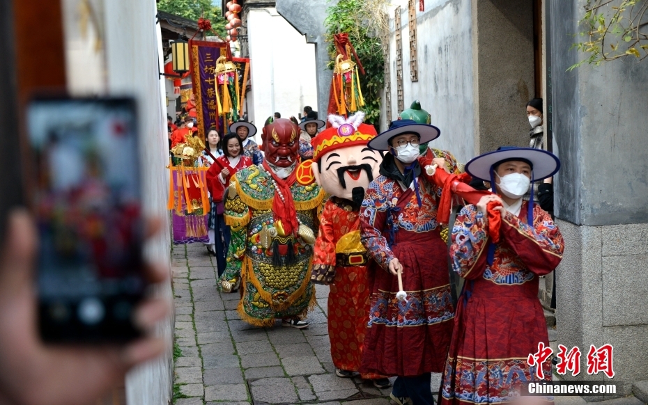 福建省泉州市晋江梧林传统古村落,“电音三太子”的表演引得众多游客纷纷互动拍照,体验现代与传统交融的浓浓年味。赖进财摄