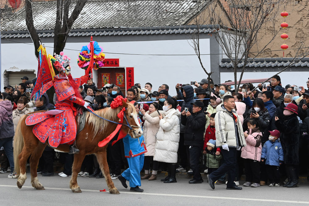2月12日,马社火演员在陇县元宵节社火巡游活动上表演。