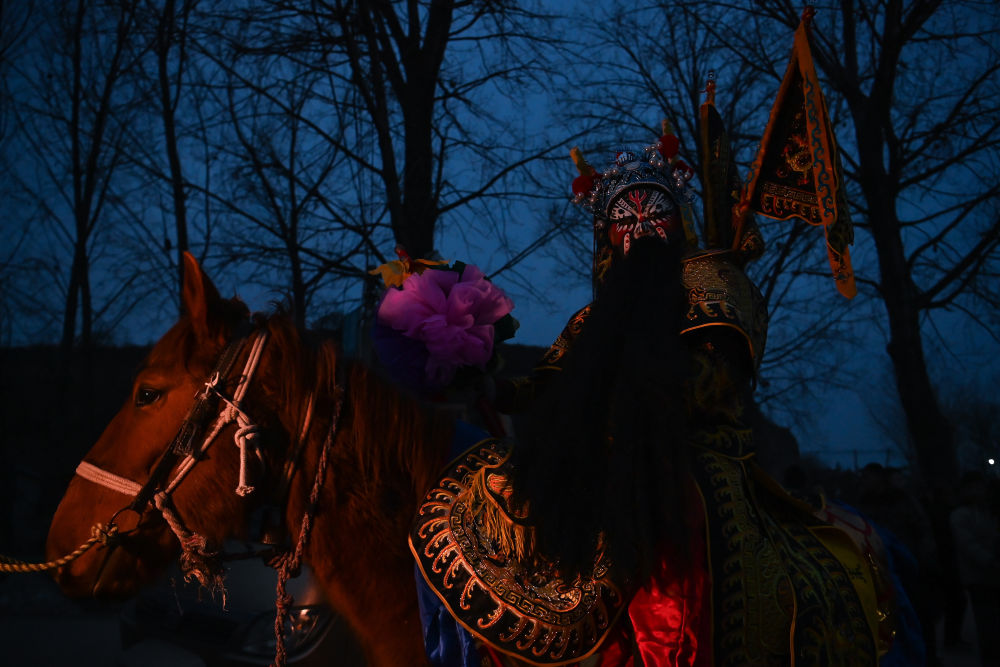 2月11日清晨,陇县黄花峪村的马社火演员准备出发游演。