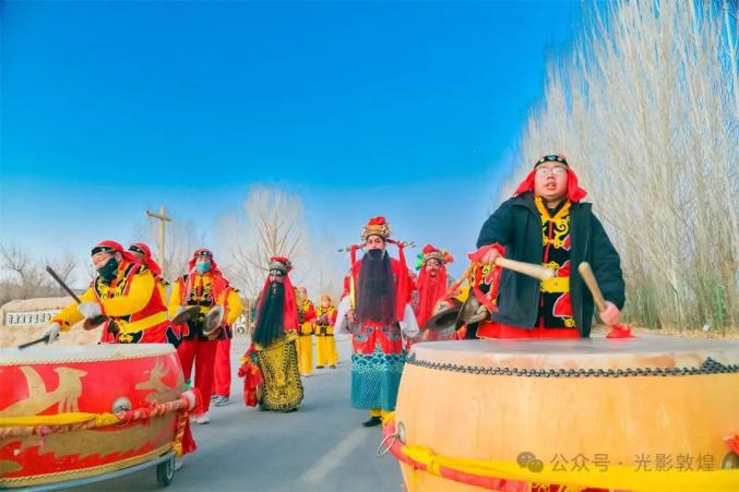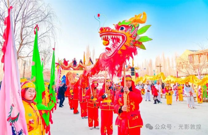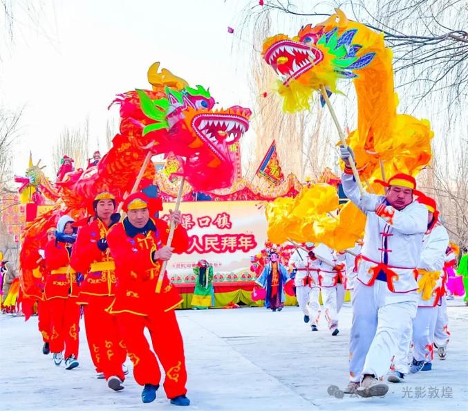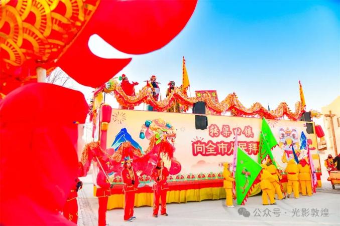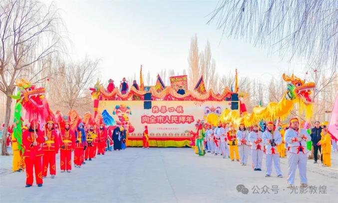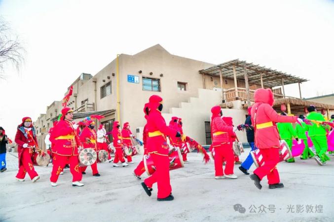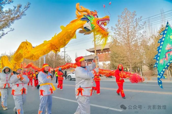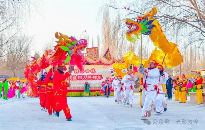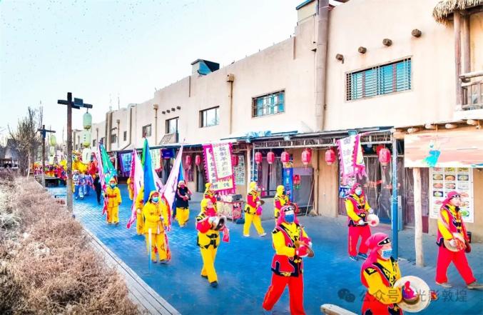来自敦煌市转渠口镇社火队的200余名社火队员身着盛装,敲响震天的锣鼓,舞长龙、耍狮子、扭秧歌……在鞭炮声中浩浩荡荡地进入月牙泉小镇,穿过古色古香的街巷,在中心街广场集结,市民游客在欢歌笑语中感受着浓浓的节日氛围和民俗文化魅力。