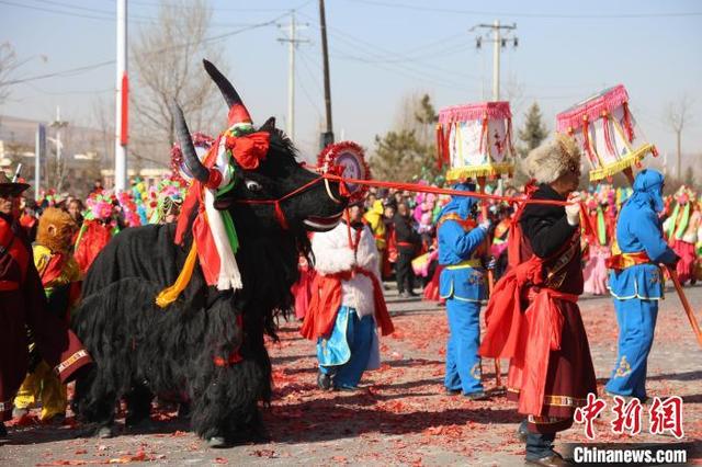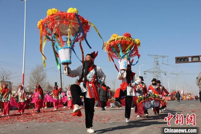 不点花灯月不圆,不耍社火难过年。2月9日,农历正月十二,青海省西宁市大通回族土族自治县10支优秀社火队进城巡演。图为传统社火表演。中新社记者 张添福 摄