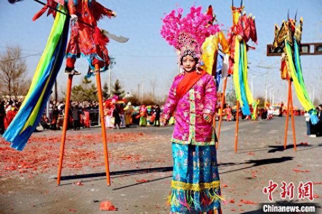 不点花灯月不圆,不耍社火难过年。2月9日,农历正月十二,青海省西宁市大通回族土族自治县10支优秀社火队进城巡演。图为踩高跷社火表演。中新社记者 张添福 摄