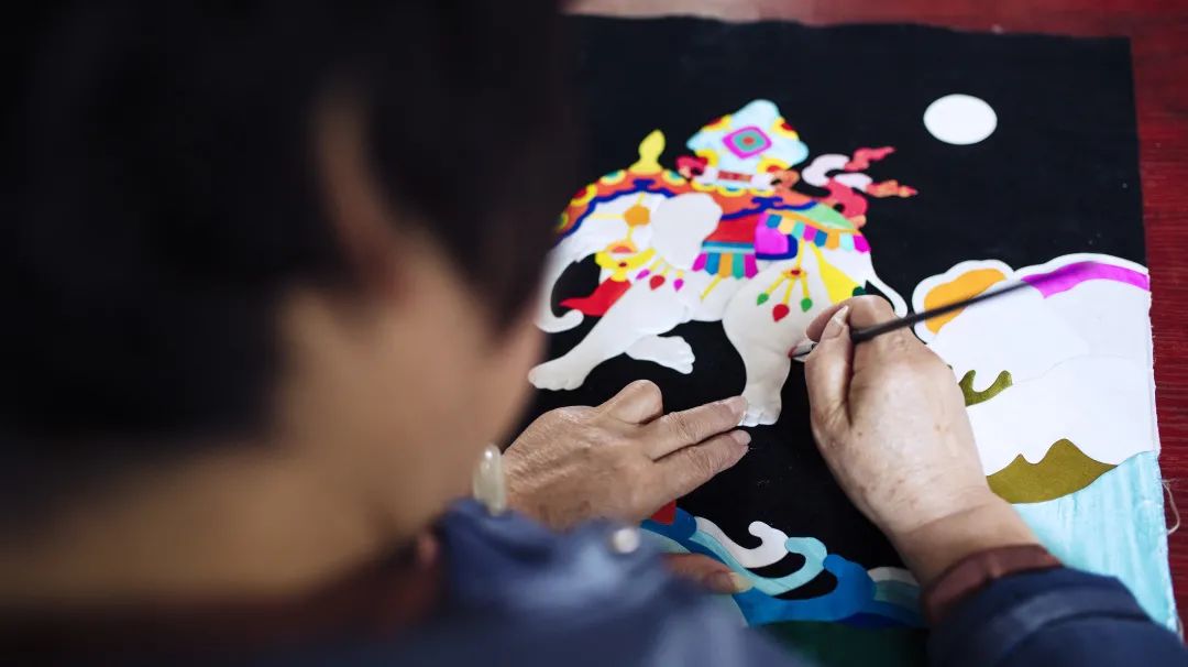 湟中堆绣作品《唐蕃古道》描绘的是文成公主进藏时在青海日月山脚下的迎娶盛况。作品采用湟中堆绣中的平面堆绣也叫“平堆”,把剪好的绸缎块平贴拼合在刺绣的布料上,然后稍加渲染,产生立体效果,画面平展匀净、色彩艳丽、工艺精湛。