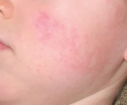 红斑最开始长在脸颊周围,典型的皮疹样子是「拍打样面颊」,像被人打过耳光一样,1~4 天后孩子的手脚处也会长出红疹。