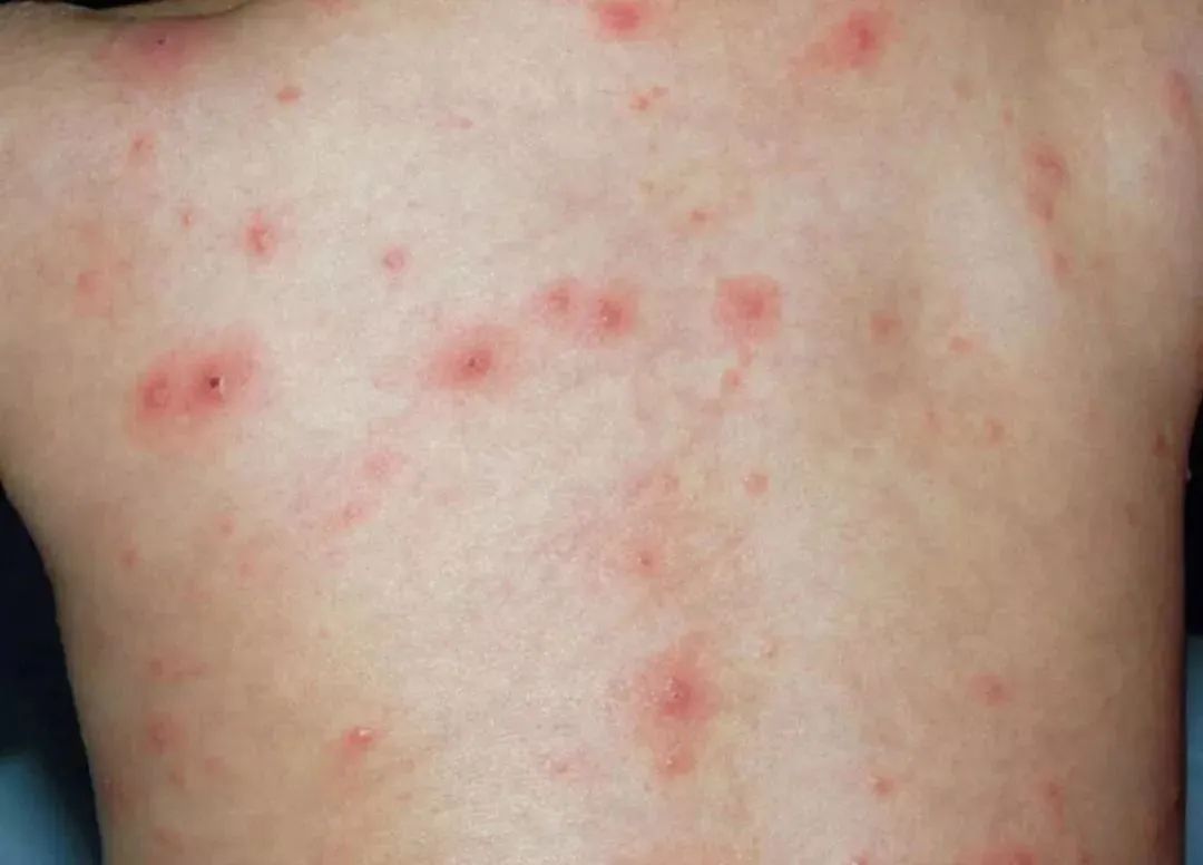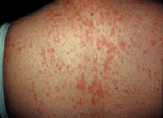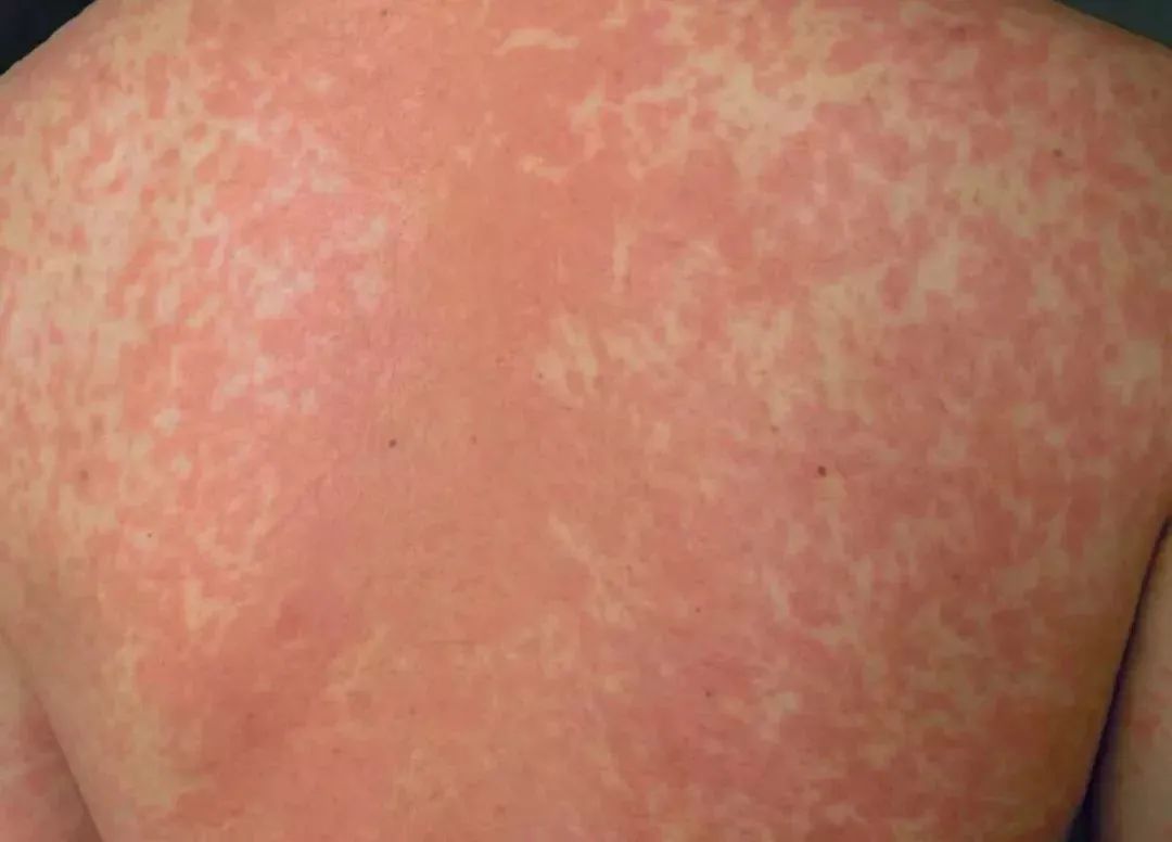 皮疹起初长在胳膊和上身,看起来像麻疹或者荨麻疹,瘙痒明显。