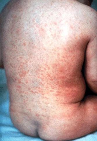 皮疹特点:高热3-5天热退疹出。红色细小密集斑丘疹(见图3),头面颈及躯干部多见,四肢较少,一天出齐,次日即开始消退。