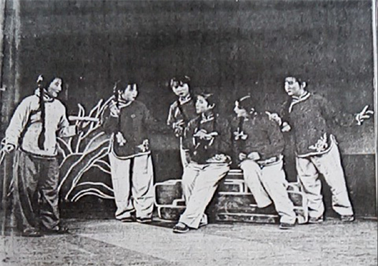 1958年6月间,剧团提出自创现代剧目的号召,这时正值剧团在庄浪县巡回演出,那里有一片“六姑娘”种的试验田,搞密植生产“放卫星”,我和剧团同志去参观并搜集素材、体验生活,连夜写出了小戏《六姑娘》,第二天投入排练,当晚粉墨登场,做到了“三快”——写得快,排得快,演得快。由此体现了当时的文艺工作者,在那个特殊的年代里,把当地的真人真事用陇东道情形式搬上舞台的热情。当地领导看了这出戏后很兴奋,观众对这一新生事物也报以热烈的掌声。