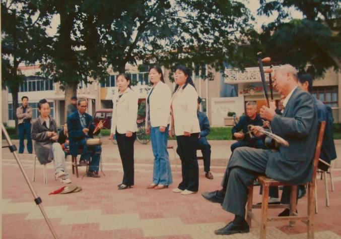 ▲民间艺人崔雪、王烈琴、关红英和芮谷秦声聚乐苑乐队在县文化广场表演民歌