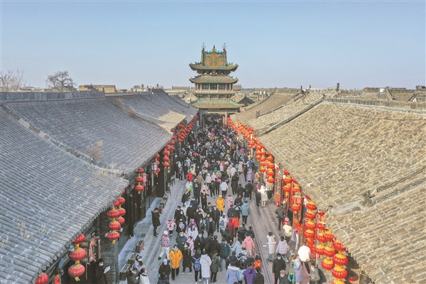 平遥古城中轴线南大街上,大红灯笼高高挂起,鳞次栉比的店铺人来人往。威风锣鼓队、旱船推车、大头娃娃等民俗表演热烈喜庆,现场掌声、喝彩声此起彼伏。“平遥中国年”活动期间,平遥再次向世界发出邀请,推出主题灯展、文化体验、传统社火汇演等系列活动,推光漆器、民间剪纸、手工布艺……热情的平遥人与八方来客共享年俗文化大餐。