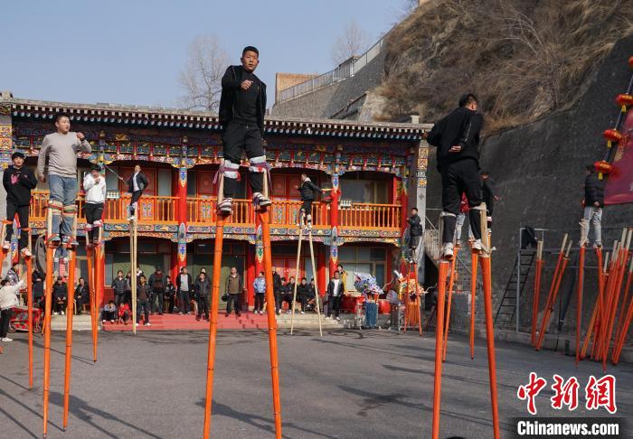 图为在青海省西宁市湟中区鲁沙尔镇,青年男子进行高跷表演排练。 马铭言 摄