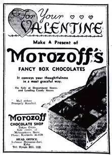1936年2月12日,在情人节的前两天,莫洛佐夫糖果公司在英语读物《The Japan Advertiser》上刊登广告:“将莫洛佐夫的精美盒装巧克力作为情人节礼物,送给你的爱侣”。巧克力店老板从儿子的名字(Valentine)与情人节(S.Valentine’s Day)的巧合中,成就了一个天才的营销广告。