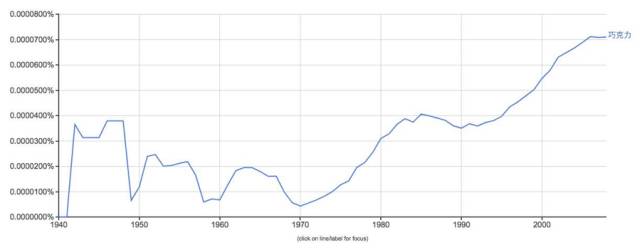 用数据说话,下图来自Google Ngram的数据——Ngram的数据来自谷歌520万本数字化图书的词频统计,搜索词为chocolate(巧克力)。
