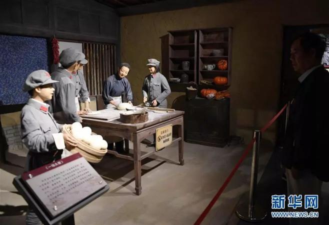 ▲8月16日,在红军长征哈达铺纪念馆,参观者观看反映哈达铺群众教红军做面食的蜡像。在哈达铺期间,不少来自南方的红军战士向当地群众学会了制作馒头、大饼等面食。新华社记者 马宁 摄