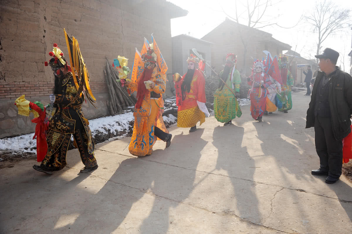 经介绍,凡是邀请进家祈福的人家,要么献上一面绸布被单,要么拿出10块钱交给社火队,既是对神灵的敬意,也是对社火队辛苦的犒劳。图为社火队里专门负责收钱的老人背着手走在队伍的后面。