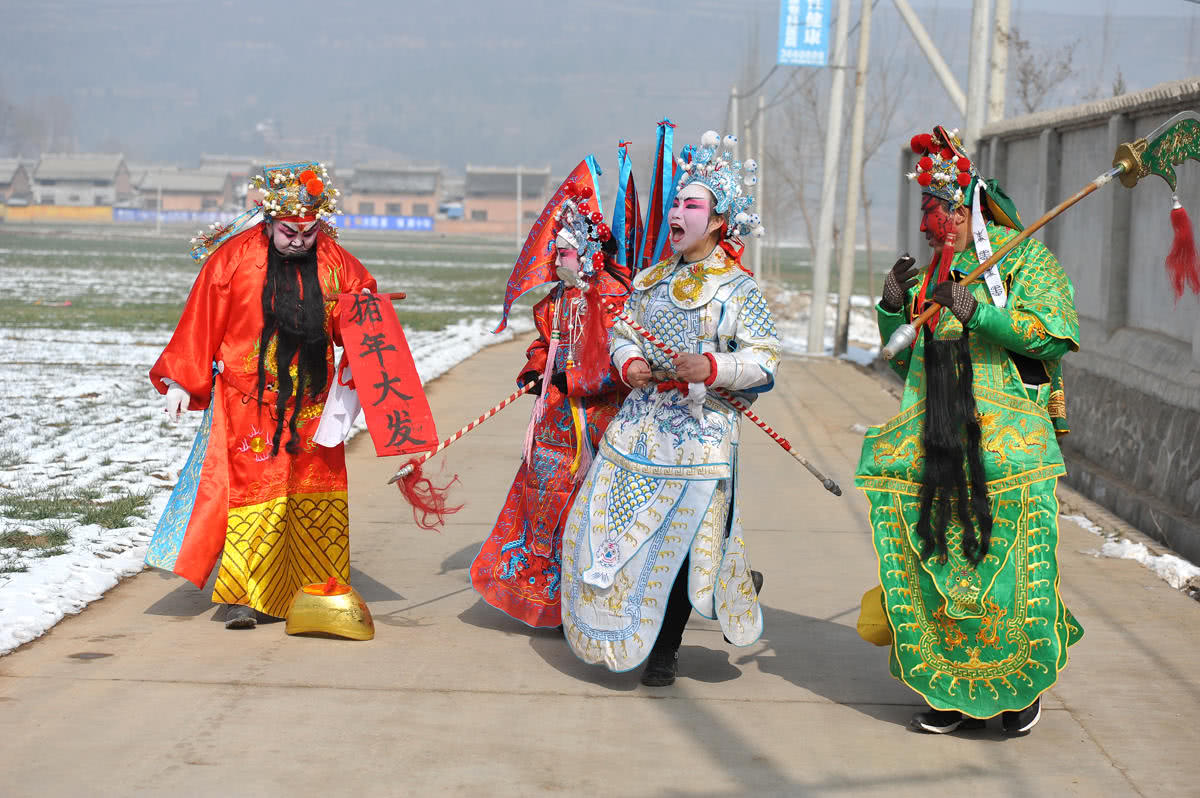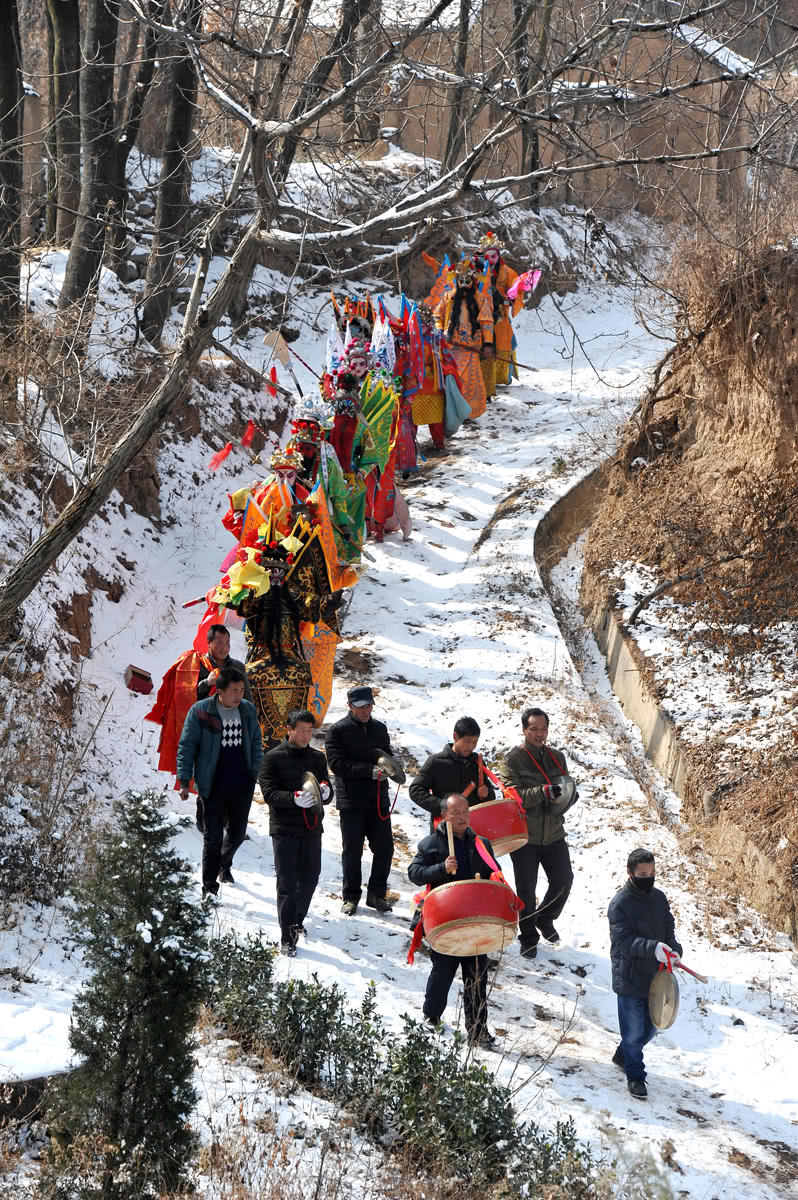 “社火” 是节日迎神赛会扮演的杂戏杂耍。起初,“社火”被称为“社虎”,之后逐渐演变成了迎春贺年的娱乐活动。陕西陇县被称为“社火之乡”。陇县社火起源于宋元,历史悠久,极富特色。每到春节,陇县大小村庄的社火队就开始物色人员,然后从大年初二开始,画脸置装、敲锣打鼓,风雪无阻地走街串巷为乡民祈福纳祥,直至正月十五后结束。图为东风镇梨林川村的社火队踏着积雪走在耍社火的路上。
