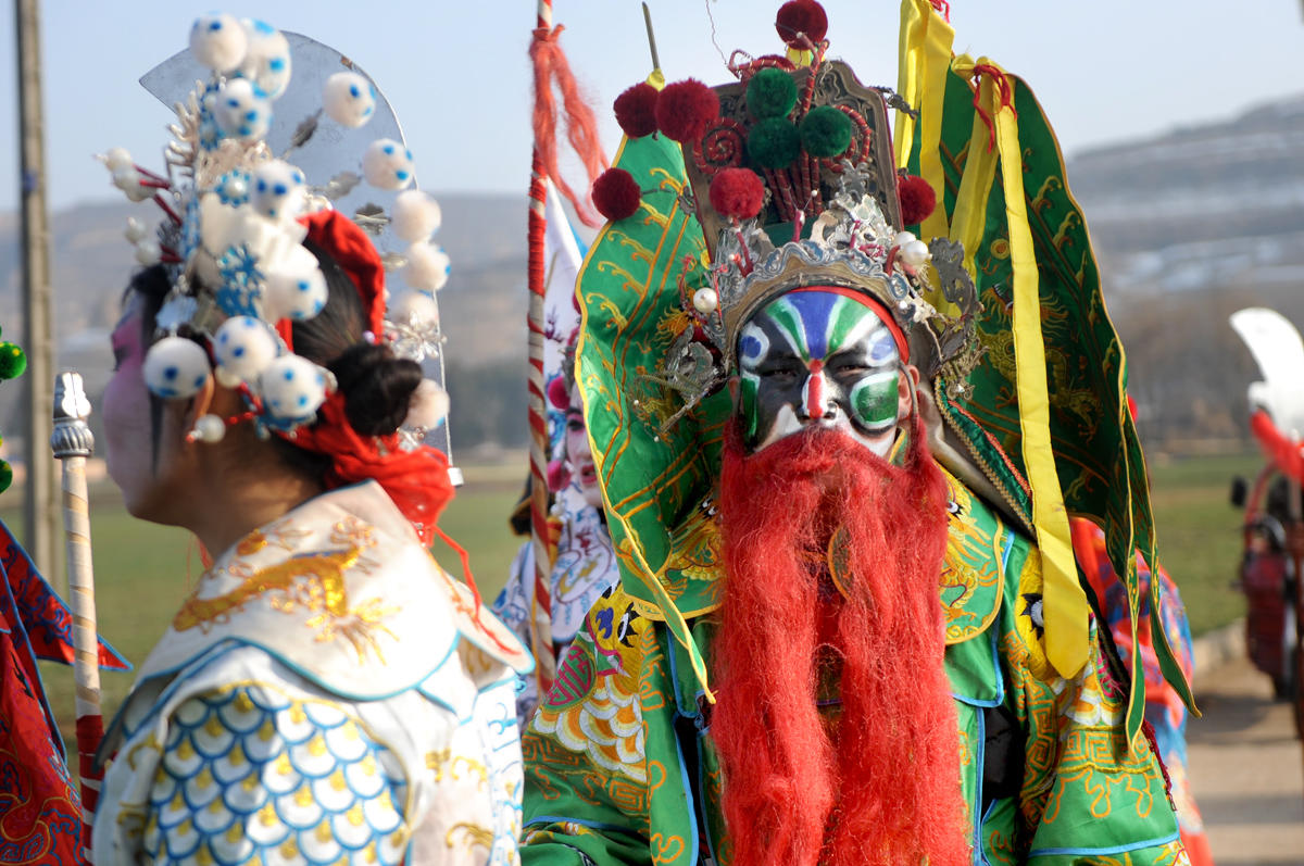 梨林川村社火队扮演的有黑虎、灵官、财神、关公、穆桂英等等,这也是陇县社火中最常见的人物。他们都取材于神话、历史演义、民间传说故事,寄托着人们降妖驱魔、辟邪镇宅、安泰吉祥、祈福求祥的美好愿望和期盼。图为所有人都准备妥当后,乐队敲响锣鼓,社火队在村委会前巡游一圈后开始前往邻村。