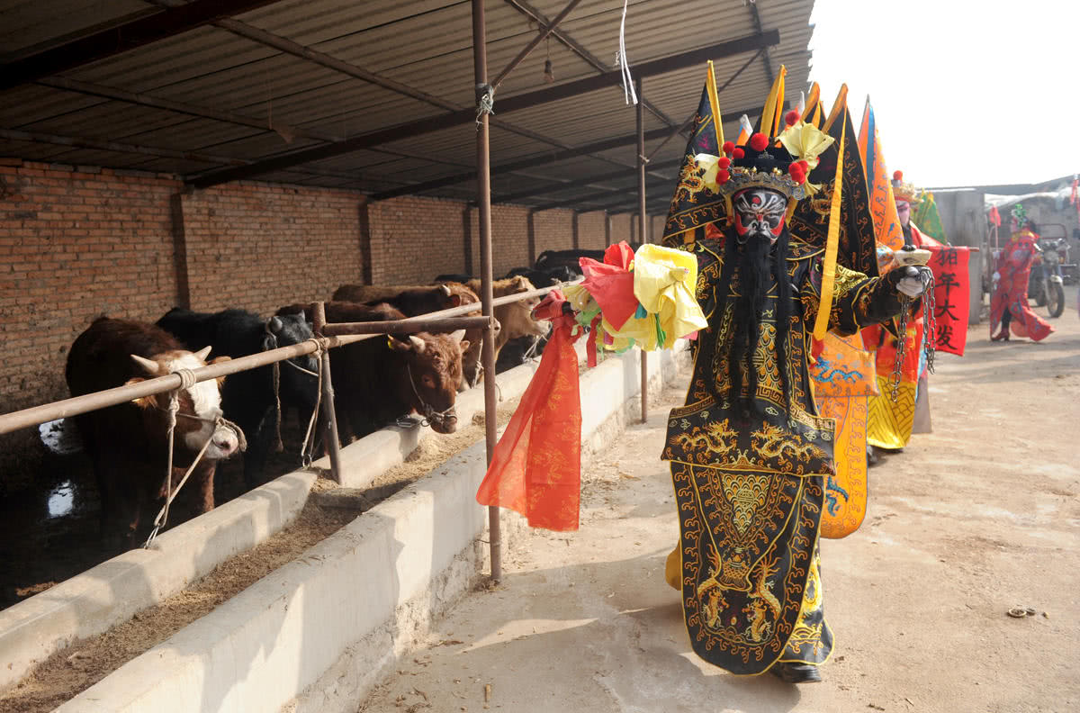 图为社火队在一户养殖专业户的养牛场巡游,祈福生意兴隆。