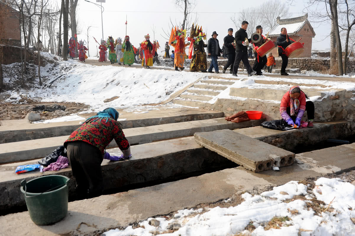 一个村子转完,社火队又沿着雪后的乡村路前往下一个村庄。村外两名妇女在路边的水沟旁洗衣服,即便是热闹的锣鼓声也没有引起她们的特别关注。马鹏说,因为每年都有社火,大家已经习惯,把这当成了过年的一部分,来看社火的大都是外地人。