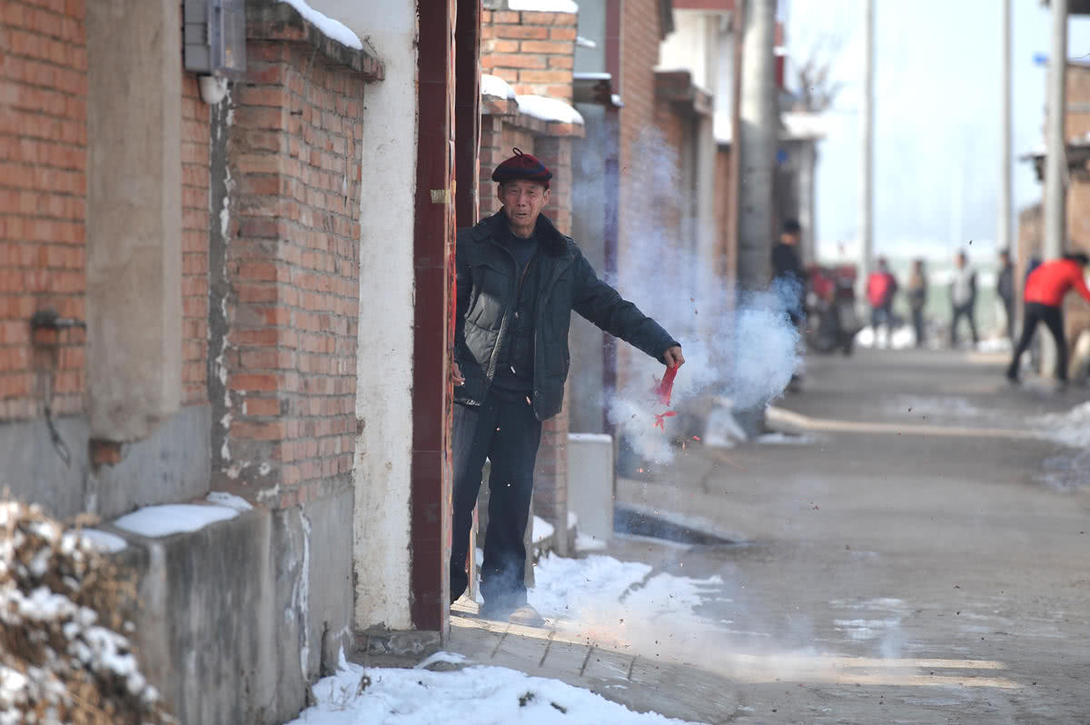 听到锣鼓声传来,一位老人点燃了手中的鞭炮,迎接社火队进家祈福。据了解,在整个春节期间,一个村子会有多个社火队造访祈福,但不管是哪个村的社火队,村民们都会热情迎接。