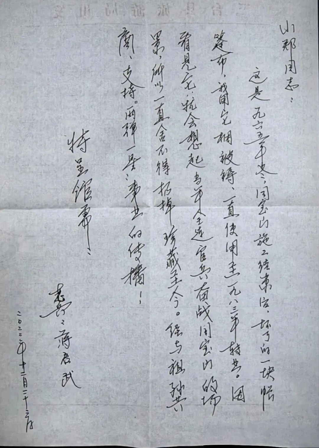 一份手写的捐赠说明娓娓道来:这是1965年冬,同宝山施工结束后,坏了的一块帐篷布,我用它捆被褥,一直使用至1983年转业。因看见它就会想起全连官兵奋战同宝山的场景,所以一直舍不得扔掉,珍藏至今。经与祖孙共商,支持‘两弹一星’事业的传播,特呈馆需。
